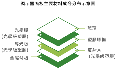友達主要產品顯示器面板,面板製造原物料主要使用為玻璃基板與半導體製程所製造之顯示器液晶盒再與相關零件和物料組裝。為選用低環境負荷與風險之原物料,我們於產品生命週期原物料階段,即對我們所使用的原物料進行關鍵原物料之分析評估,包含材質以及重量占比。再依分析結果定義關鍵原物料,優先導入再生物料的使用。